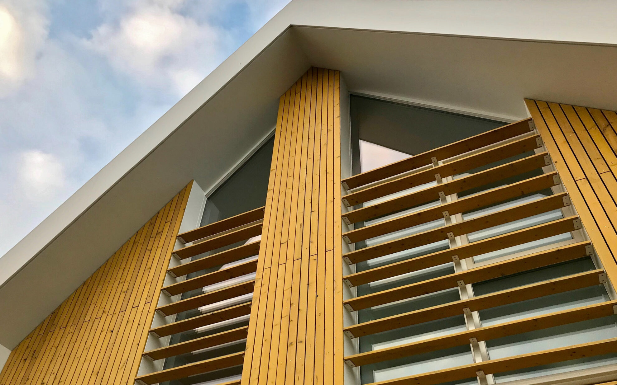 De voorgevel heeft twee brede raampartijen die tot aan de daklijn reiken en naar het zuiden gericht zijn voor maximale zoninstraling. Horizontale lamellen van geel geolied Platowood Vuren weren direct zonlicht tijdens de heetste zomermaanden.