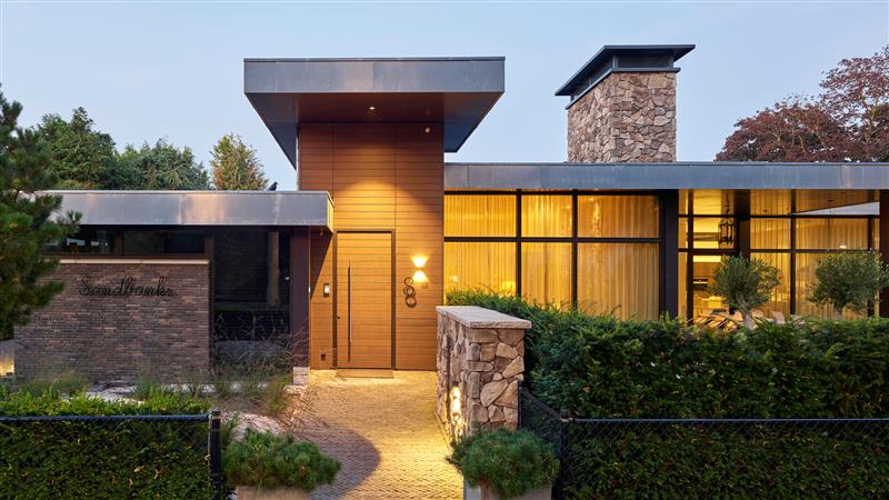 In Heeze, net onder Eindhoven, staat deze ruime, lichte bungalow met een warme uitstraling. De buitengevel bestaat uit glas, een warme kleur baksteen en geborsteld Platowood Fraké. Het hout is afgewerkt met een coating van Teknos, DRYWOOD WOODSTAIN VV MATT, in een speciaal voor dit project bemonsterde kleur. Het geborstelde hout geeft niet alleen een mooie structuur, maar zorgt ook voor een optimale verankering van het coatingsysteem.