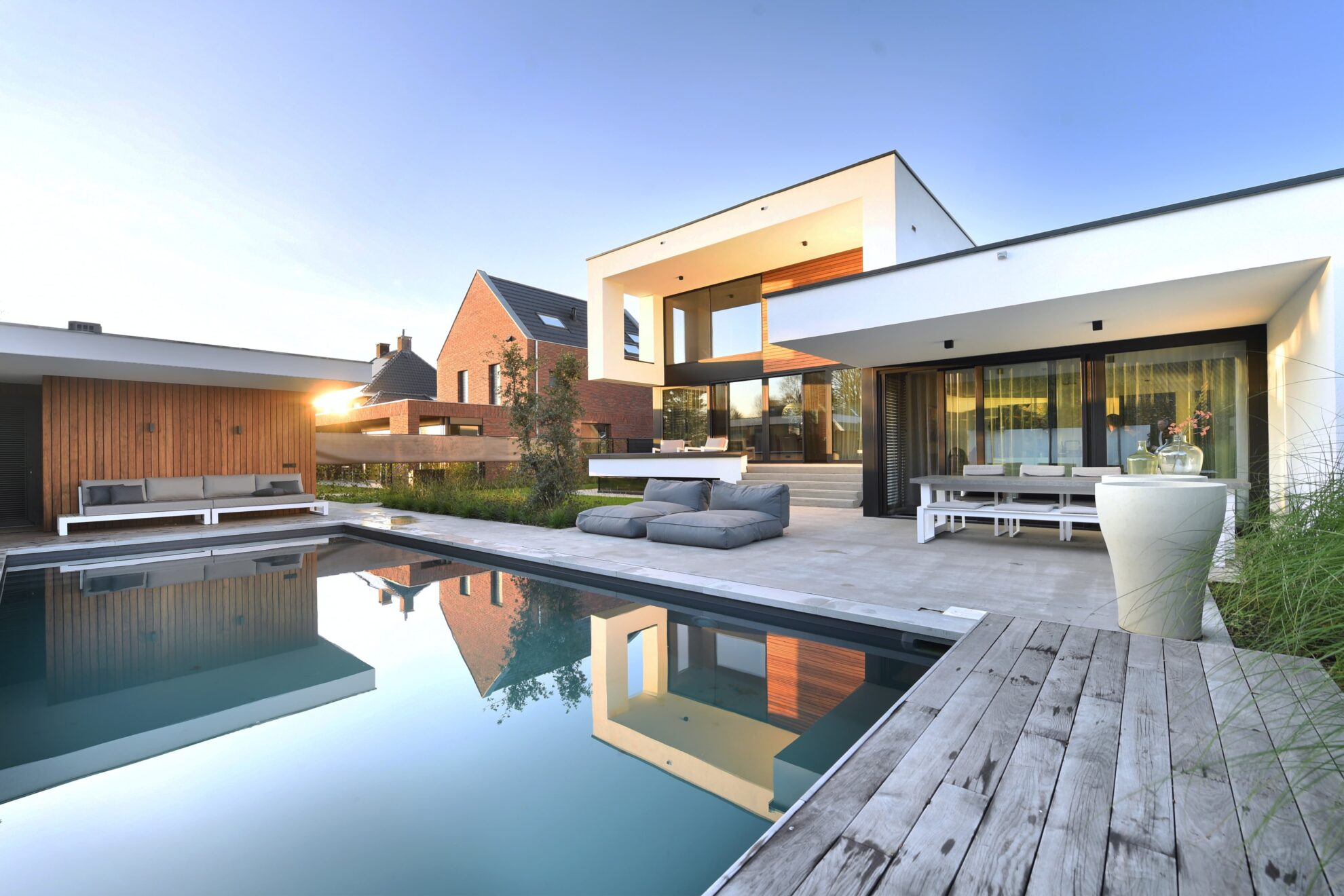 In Sambeek, Noord-Brabant, is een prachtige moderne villa gerealiseerd. Zowel de gevel van de woning als van het poolhouse is bekleed met Platowood Fraké, afgewerkt met Natural Color Oil.