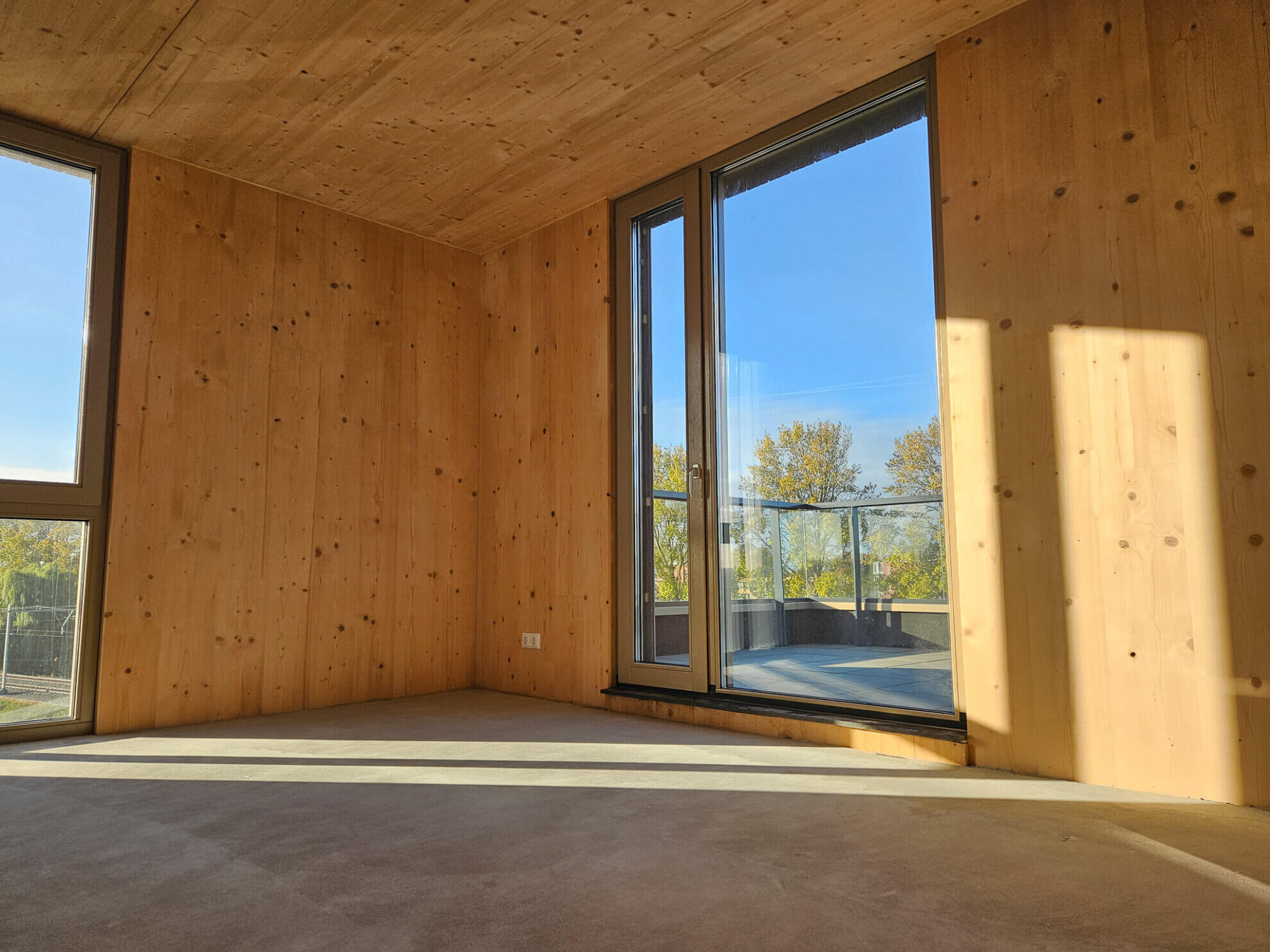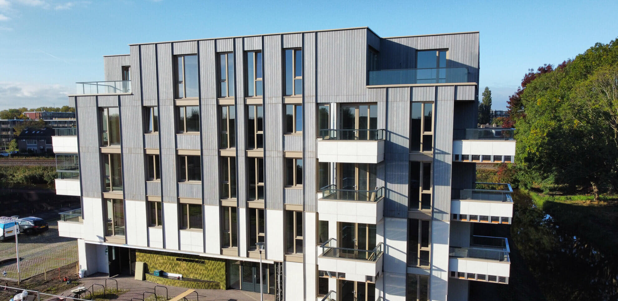 In Pijnacker vormt hout de basis van het gebouw — van de wanden en vloeren tot de kern en de vrij uitkragende balkons. Ook binnen blijft het materiaal zichtbaar, waardoor bewoners dagelijks de warmte en natuurlijke sfeer van hout ervaren.