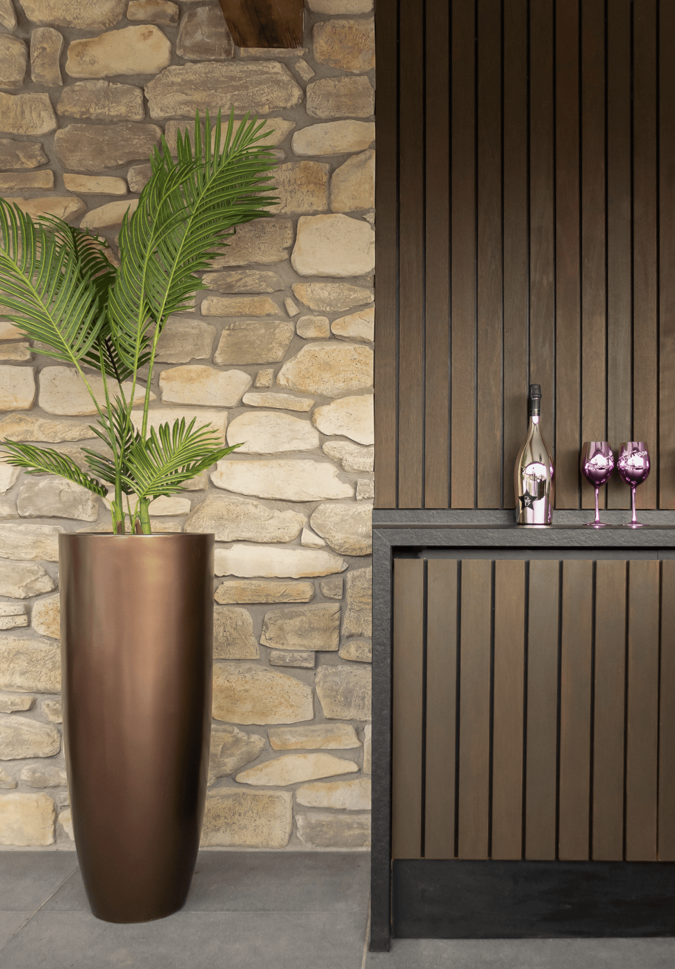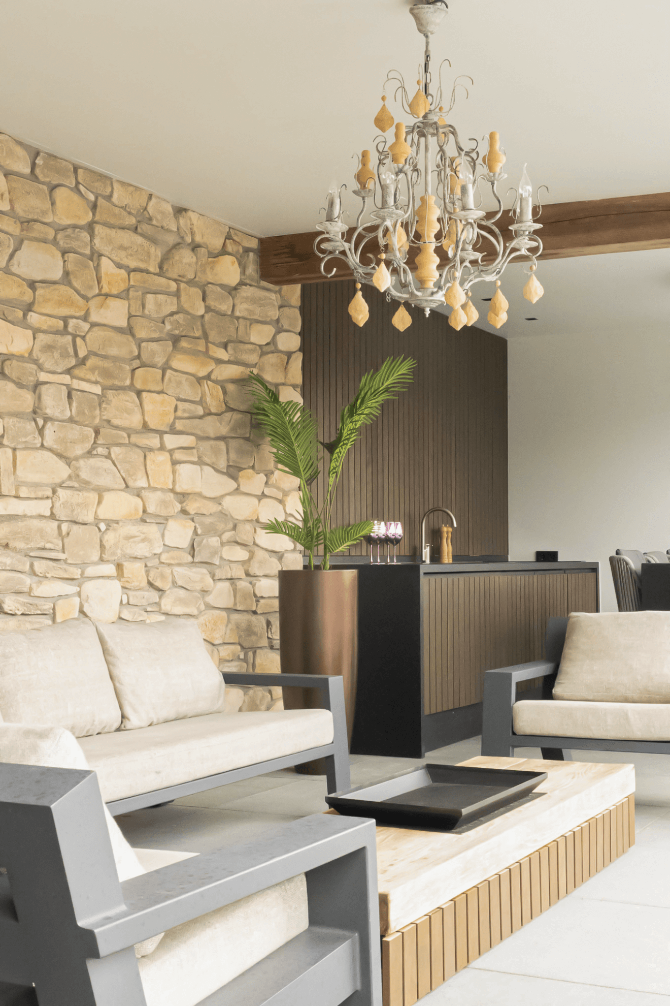 De steenstrips geven de buitenkeuken een warm, mediterraan karakter en vormen een krachtig contrast met het geplatoniseerde hout. De Fraké latten komen terug in het keukenmeubel en de achterwand en lopen door in de wand van het tv-meubel, waar tussen de latten subtiele opbergruimte is geïntegreerd. Zo ontstaat één samenhangend geheel waarin esthetiek, functionaliteit en de duurzame kwaliteiten van Platowood samenkomen.
